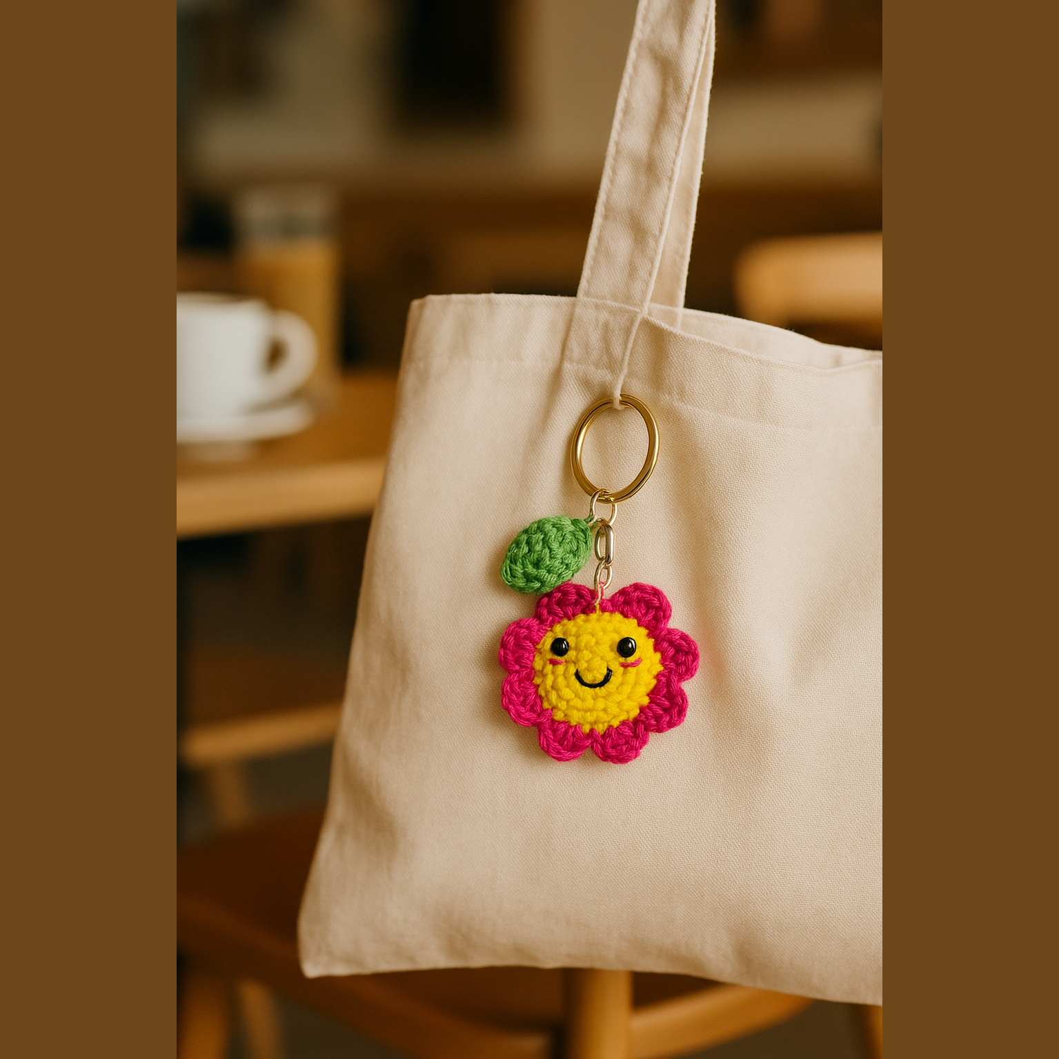 Handmade with love, this bright and cheerful crochet flower charm features a sunny smile, soft petals, and a green leaf for that extra touch of cuteness. Perfect for clipping onto your tote, sling, backpack, or even as a car charm.